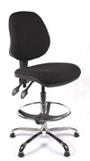 A quality fabric upholstered medium back draughtsman chair with a chrome base, 14" chrome gas lift and adjustable foot ring. Offering all-day comfort with a high back and PCB mechanism,  providing  flexibility and functionality.